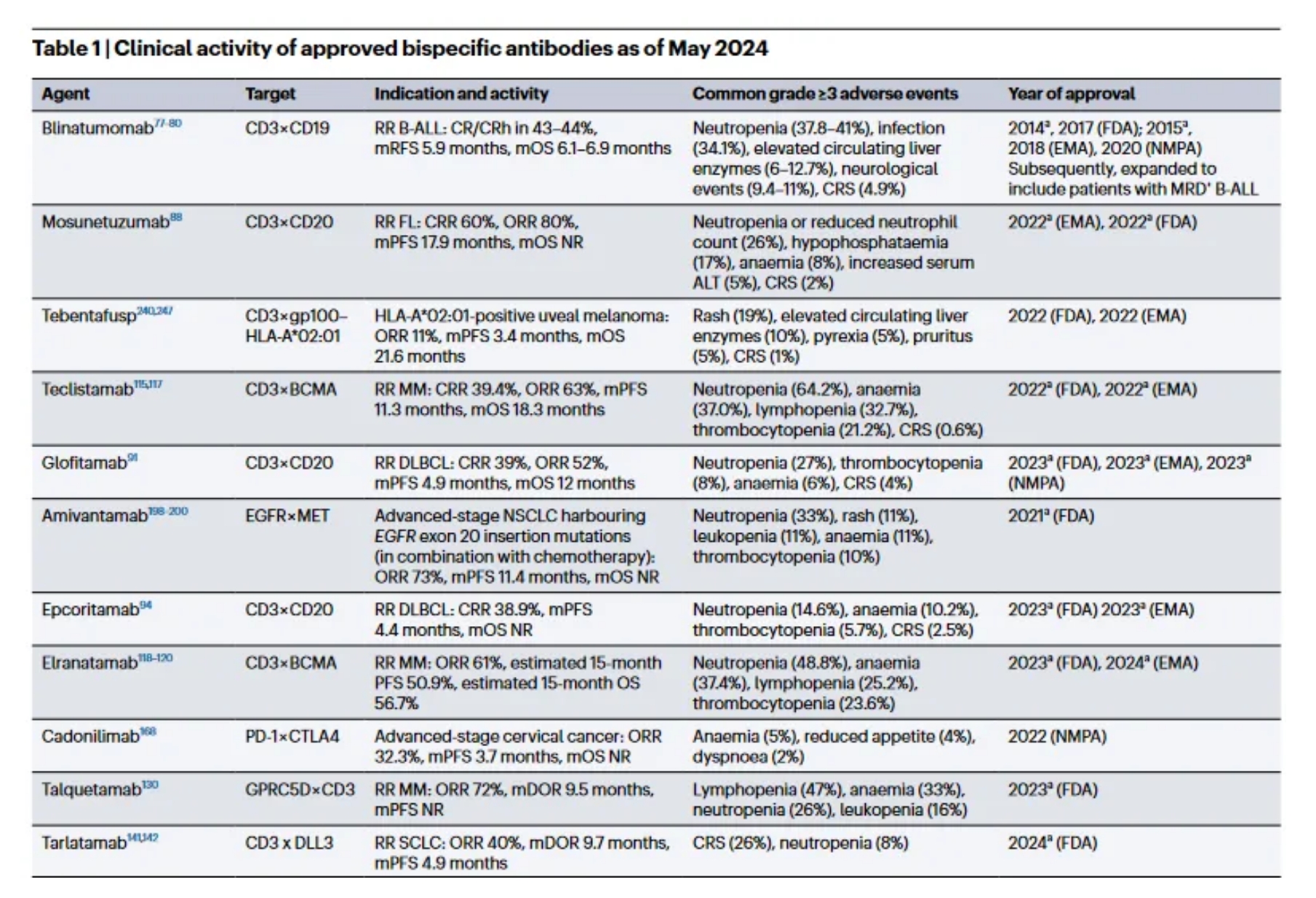 圖2 截至2024年5月批準的雙特異性抗體的臨床試驗情況