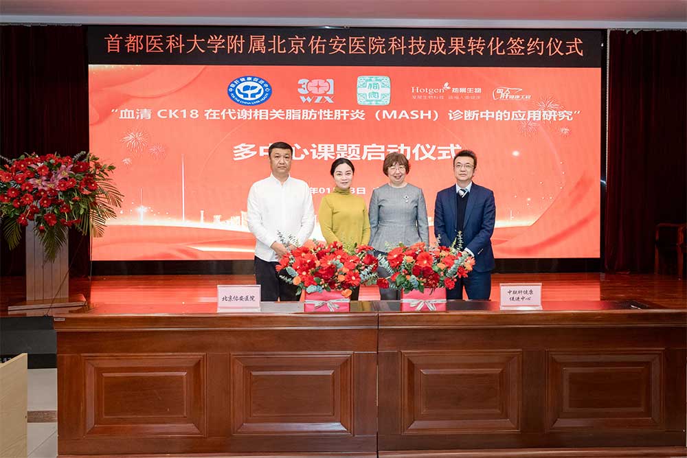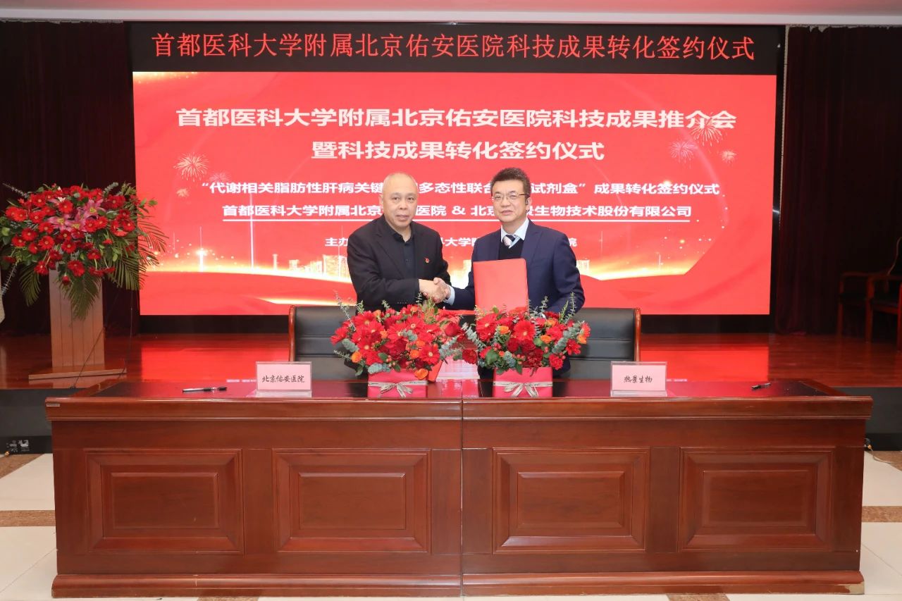 馬迎民院長代表我院與大興區(qū)上市企業(yè)熱景生物就肝病中心三科張晶主任主導(dǎo)研發(fā)的“代謝相關(guān)脂肪性肝病(MAFLD)關(guān)鍵基因多態(tài)性聯(lián)合檢測試劑盒”簽訂轉(zhuǎn)化協(xié)議。