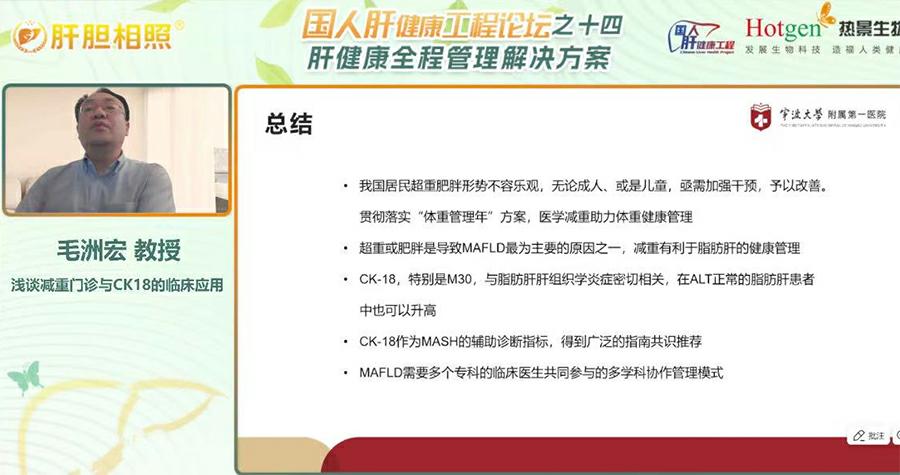 寧波大學(xué)附屬第一醫(yī)院內(nèi)分泌科毛洲宏教授在會(huì)議上圍繞“減重門診與CK18的臨床應(yīng)用”作專題報(bào)告,強(qiáng)調(diào)國家衛(wèi)健委“體重管理年”政策推動(dòng)下,醫(yī)療機(jī)構(gòu)需加強(qiáng)減重門診建設(shè),為超重及肥胖人群提供專業(yè)化服務(wù)。毛教授也以本院“肥胖俱樂部”在開設(shè)近十年的真實(shí)經(jīng)驗(yàn),給我們科普了減重管理的重要性。目前,我國超重肥胖形勢嚴(yán)峻,超50%成人存在體重異常,肥胖與代謝相關(guān)脂肪性肝病(MAFLD)密切相關(guān),約20% MAFLD患者可能進(jìn)展為脂肪性肝炎(MASH),T2DM患者合并MAFLD比例高達(dá)65.04%。毛教授指出,傳統(tǒng)檢測手段如ALT、B超在早期診斷MASH及纖維化中存在局限性,而細(xì)胞角蛋白18(CK-18)片段作為新型生物標(biāo)志物,通過M30/M65片段可無創(chuàng)評估肝細(xì)胞凋亡與壞死,其敏感性與特異性顯著優(yōu)于傳統(tǒng)指標(biāo)。此外,MAFLD需多學(xué)科協(xié)作管理,結(jié)合減重、改善代謝、抗纖維化等綜合干預(yù)措施,定期監(jiān)測高危人群。毛教授總結(jié)稱,CK18的應(yīng)用將推動(dòng)MAFLD精準(zhǔn)診療,而政策支持與多學(xué)科模式普及,為肥胖及相關(guān)代謝疾病防控注入新動(dòng)力。