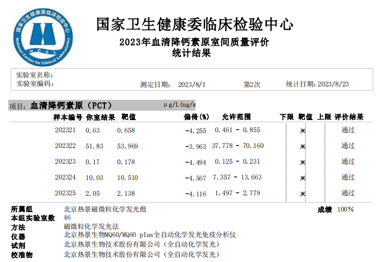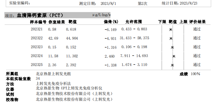 血清降鈣素原(PCT)室間質(zhì)評(píng)成績單(UPT、CLIA平臺(tái))