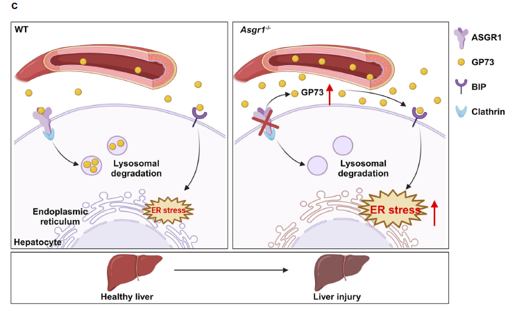 肝臟損傷是多數(shù)肝臟疾病的核心病理過程,然而其發(fā)生與進(jìn)展中的遺傳易感因素仍未充分揭示。本研究發(fā)現(xiàn),唾液酸糖蛋白受體1(ASGR1)在肝纖維化或肝硬化患者及遭受肝損傷的雄性小鼠中表達(dá)下調(diào)。ASGR1缺陷會加重乙酰氨基酚誘導(dǎo)的急性肝損傷和CCI4誘導(dǎo)的慢性肝損傷,而其過表達(dá)則能減輕這些損傷。機制上,ASGR1與內(nèi)質(zhì)網(wǎng)應(yīng)激介質(zhì)GP73結(jié)合,促進(jìn)其溶酶體降解。ASGR1耗竭導(dǎo)致循環(huán)中GP73水平升高,并促進(jìn)GP73與BIP相互作用,激活內(nèi)質(zhì)網(wǎng)應(yīng)激,進(jìn)而引發(fā)肝損傷。中和GP73不僅能緩解ASGR1缺陷引起的肝臟損傷,還能提高接受致死劑量乙酰氨基酚的小鼠存活率。研究結(jié)果表明 ASGR1 缺陷會加劇肝損傷,ASGR1-GP73 軸成為肝損傷的潛在治療靶點。