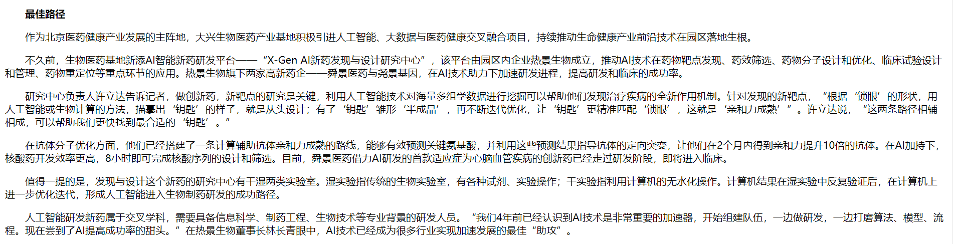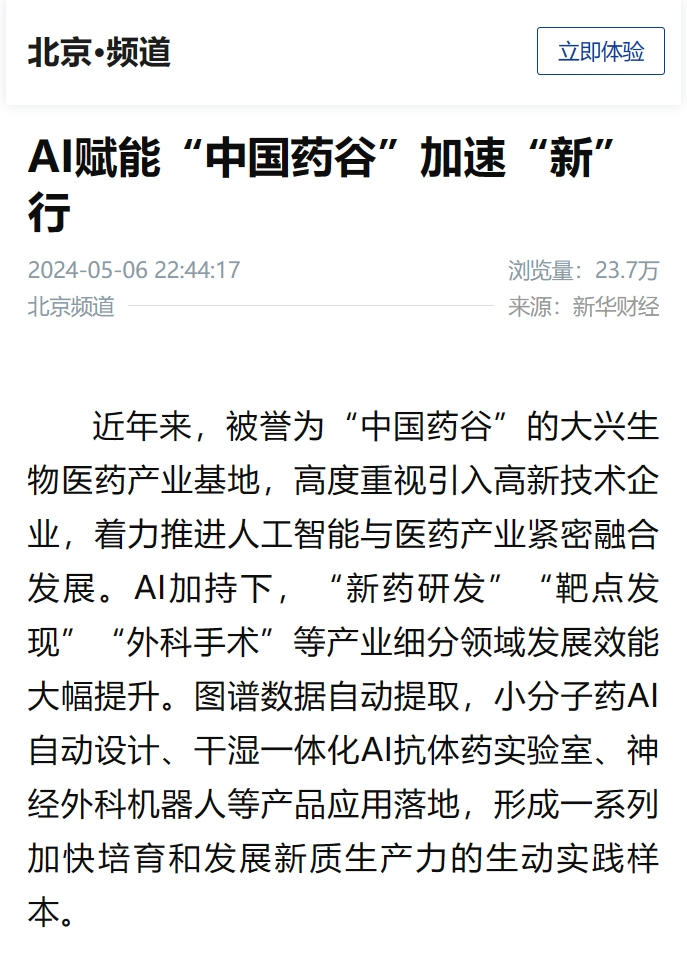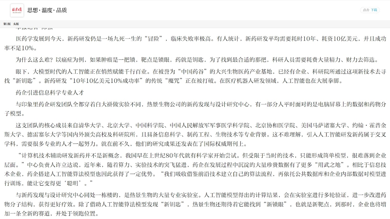 近期,人民日?qǐng)?bào)、新華社、經(jīng)濟(jì)日?qǐng)?bào)、中國外文局、北京日?qǐng)?bào)等多家媒體先后走訪熱景生物,通過報(bào)道國際先進(jìn)創(chuàng)新抗體藥物研發(fā)前行者——舜景醫(yī)藥、X-Gen AI新藥發(fā)現(xiàn)與設(shè)計(jì)研究中心最新研發(fā)管線進(jìn)展、學(xué)術(shù)成果等實(shí)踐案例,進(jìn)一步揭開AI加速FIC抗體藥物研發(fā)神秘面紗,探索人工智能技術(shù)如何打破藥物研發(fā)“雙十定律”。