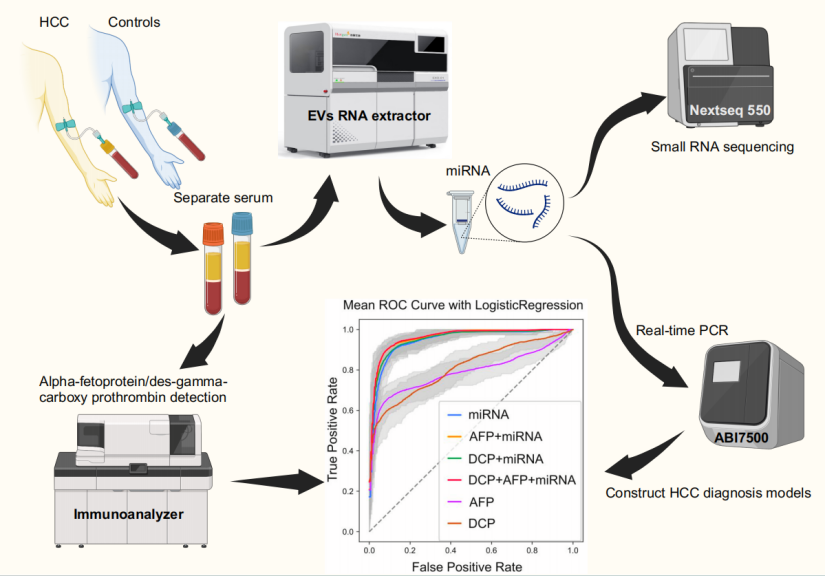 如圖1所示,研究團隊采用GlyExo-Capture?方法從88例HCC患者和179例非HCC對照組的血清中提取EVs,并從中提取small RNA 進行二代測序 (NGS)。通過生物信息學分析,識別出差異表達的miRNA。在訓練集隊列(n=134)中,研究團隊利用多種機器學習算法構建了HCC分類模型,并在多個獨立驗證隊列(n=645)中,通過定量逆轉錄聚合酶鏈式反應 (qRT-PCR) 對5個miRNA進行定量,以驗證模型性能。