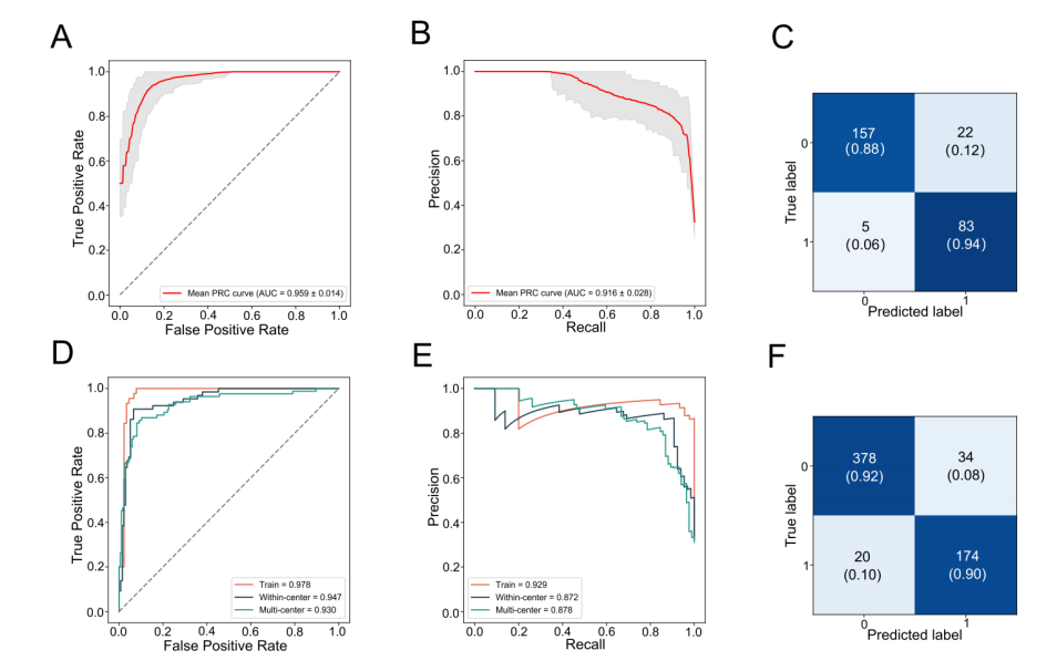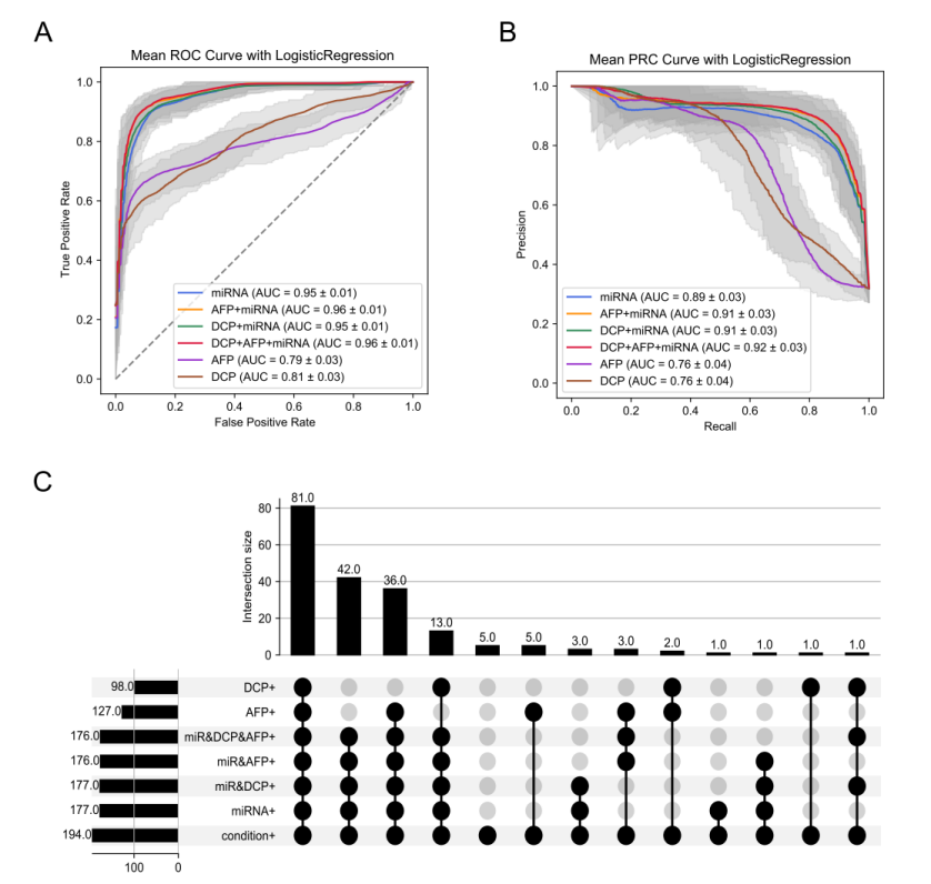 為進一步提高模型的診斷性能,我們將miRNA靶標與AFP/DCP特征結合。結果顯示,結合后模型的ROC-AUC值提升至0.96,PRAUC值達到0.91(圖3A-B)。此外,基于該聯(lián)合特征的模型對194例HCC患者的總體靈敏度達到90.70%,顯著高于單獨使用miRNA靶標時的88.06%(圖3C)。這表明miRNA與蛋白特征之間具有互補作用,顯著增強了HCC的診斷準確性。