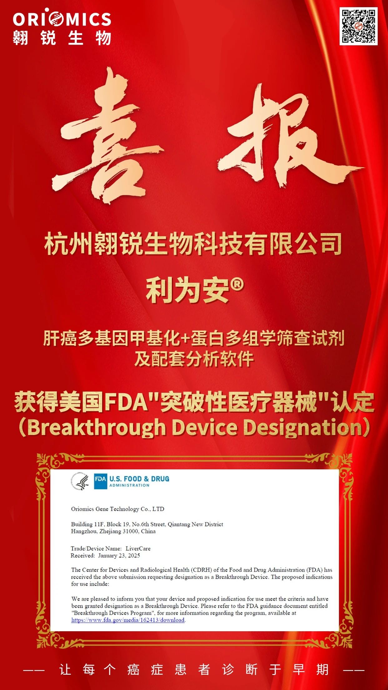 2025年3月21日,熱景生物參股企業(yè)翱銳生物旗下早篩產品利為安?——肝癌多基因甲基化+蛋白多組學篩查試劑及配套分析軟件獲得美國食品藥品管理局(FDA)“突破性醫(yī)療器械”(Breakthrough Device Designation)認定。