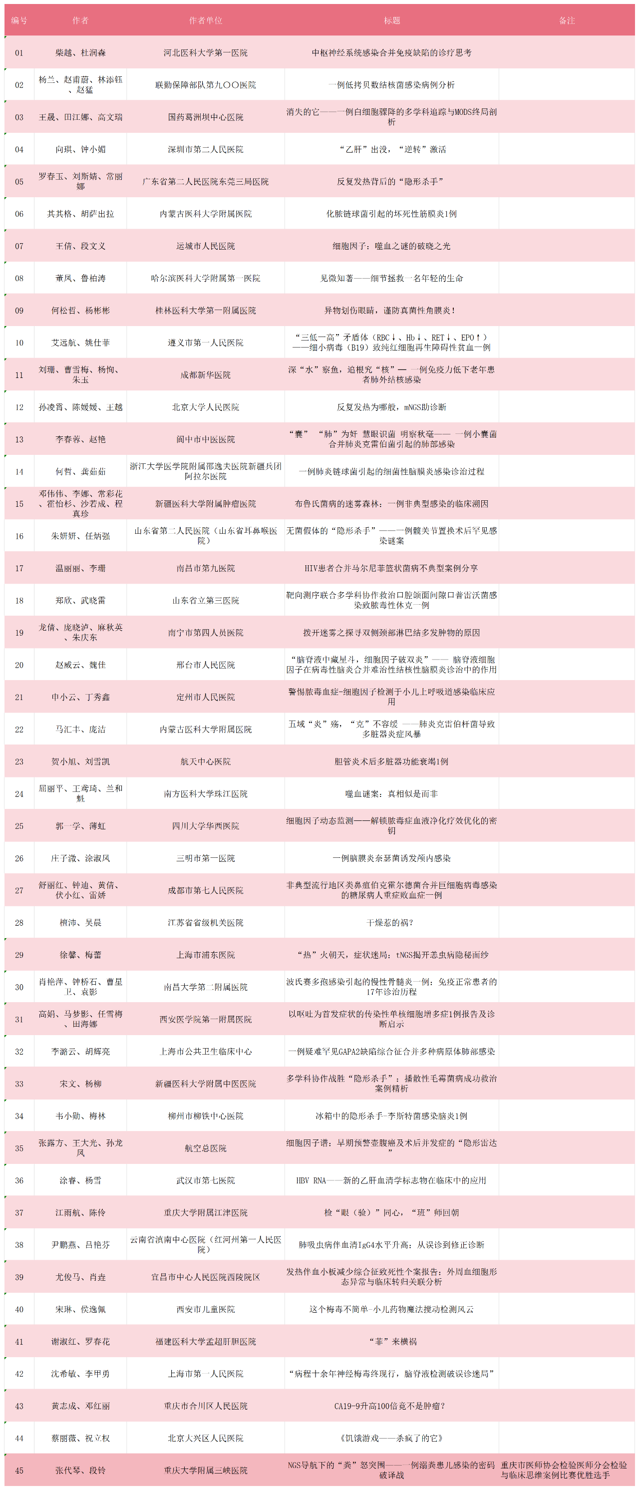 為了有效推動檢驗與臨床的深度融合,進一步提升檢驗人員的臨床思維能力,在中華醫(yī)學(xué)會檢驗醫(yī)學(xué)分會青年學(xué)組指導(dǎo)下,西部數(shù)智醫(yī)療研究院、《檢驗醫(yī)學(xué)》雜志、檢驗醫(yī)學(xué)新媒體主辦,白求恩精神研究會檢驗醫(yī)學(xué)分會細胞因子與疾病檢測學(xué)組、北京熱景生物技術(shù)股份有限公司協(xié)辦的「第五屆檢驗與臨床(感染性疾病)思維案例展示活動」已全面啟動。在面向全國進行征稿,并對稿件進行雙盲雙審(同一篇稿件均由2位專家進行評審)后,根據(jù)評審結(jié)果,共納入復(fù)審稿件45篇。以下為詳細名單,排名不分先后。
